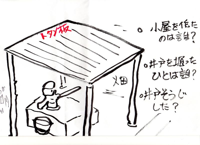 下の畑のそばに井戸があった。トタン屋根、手動のポンプ。井戸水は豊富。井戸掃除の記憶なし。誰が掘ったのかも聞いていない。